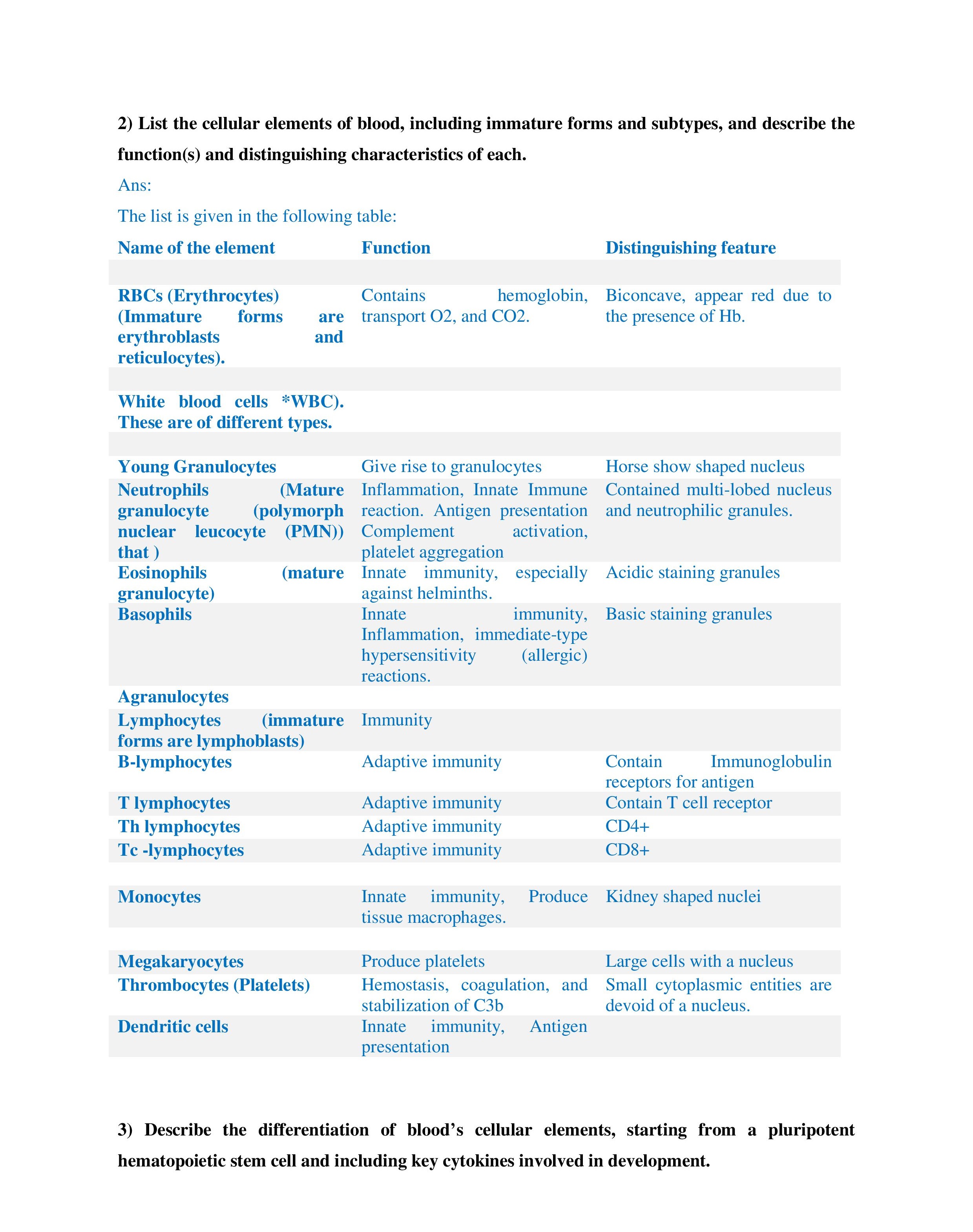 2) List the cellular elements of blood, including immature forms an...