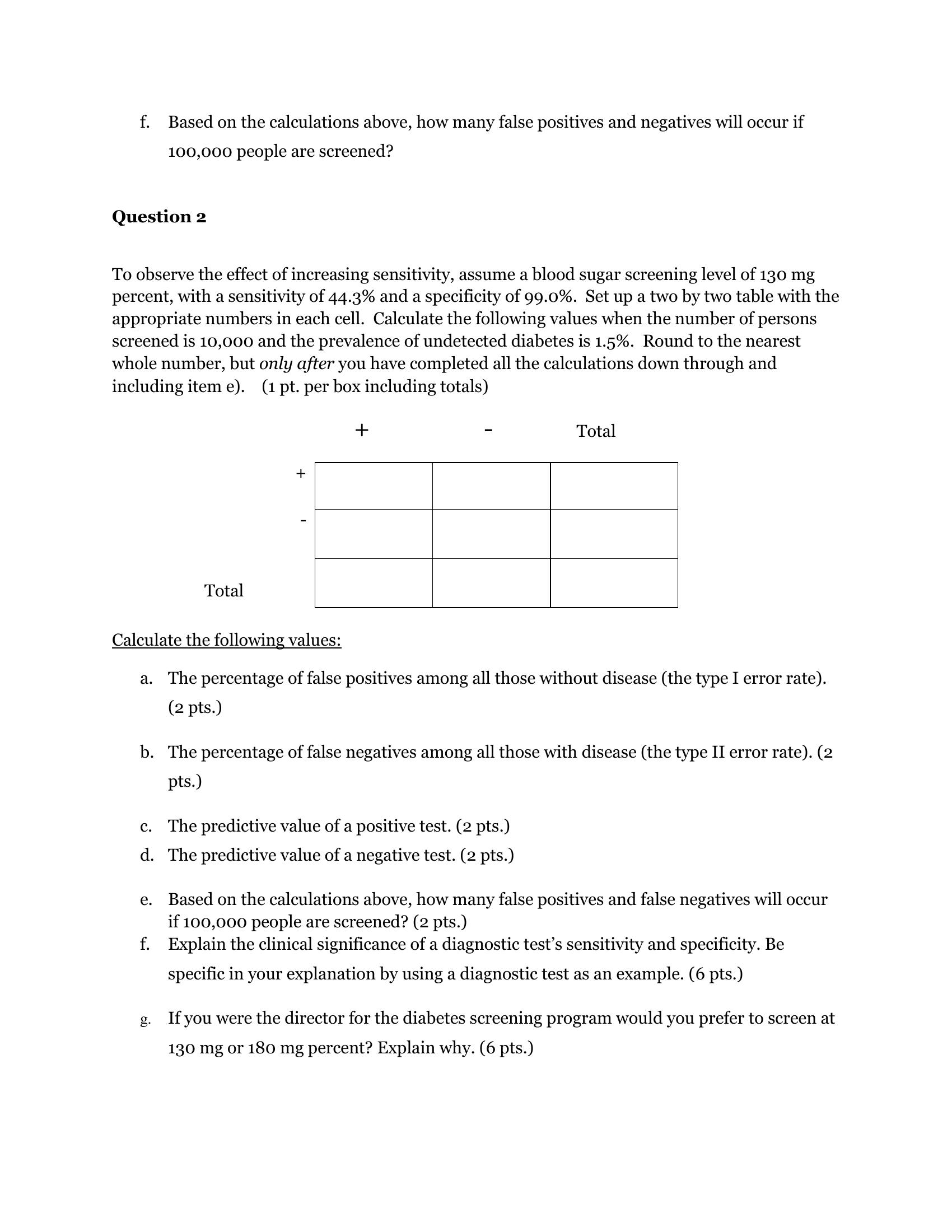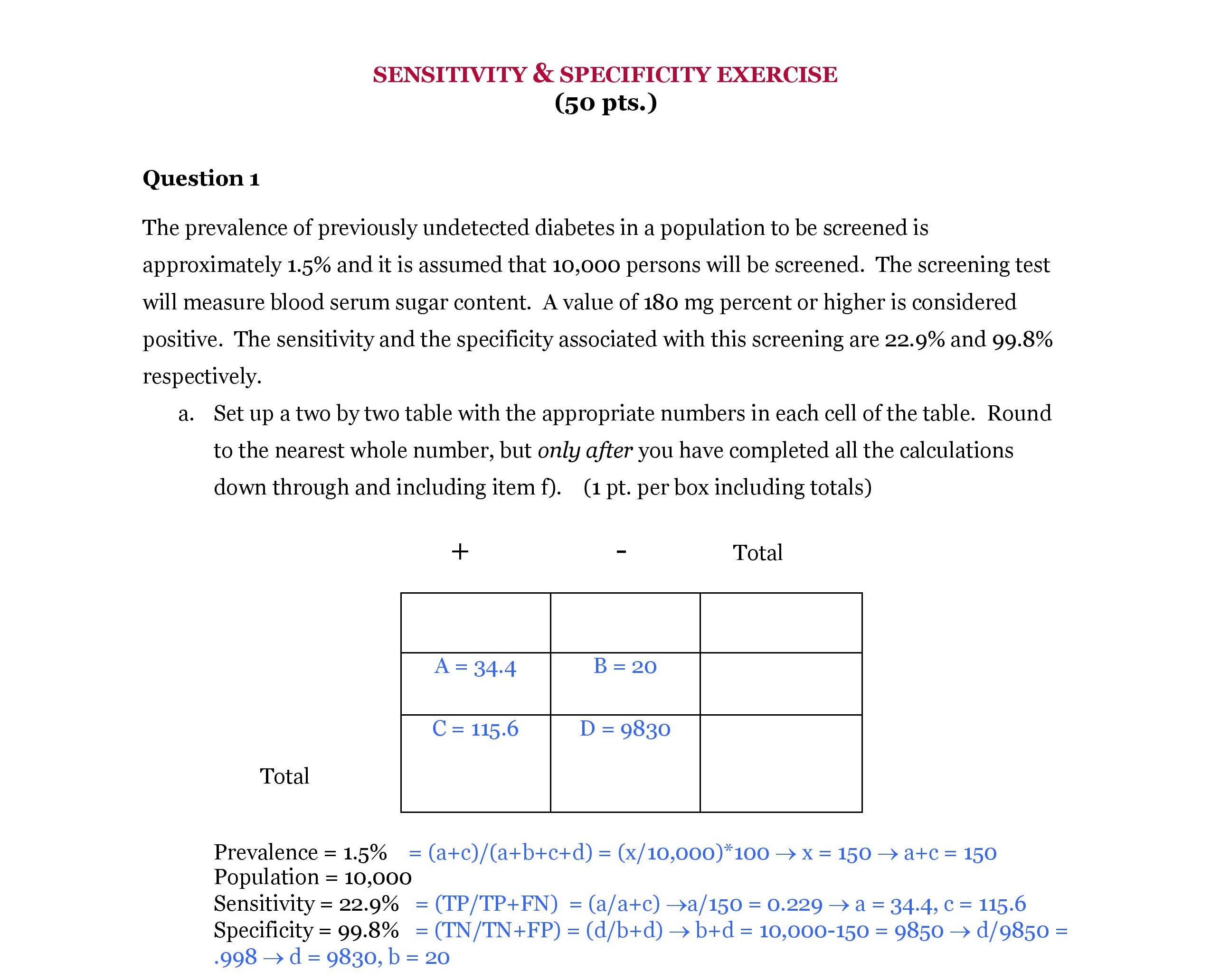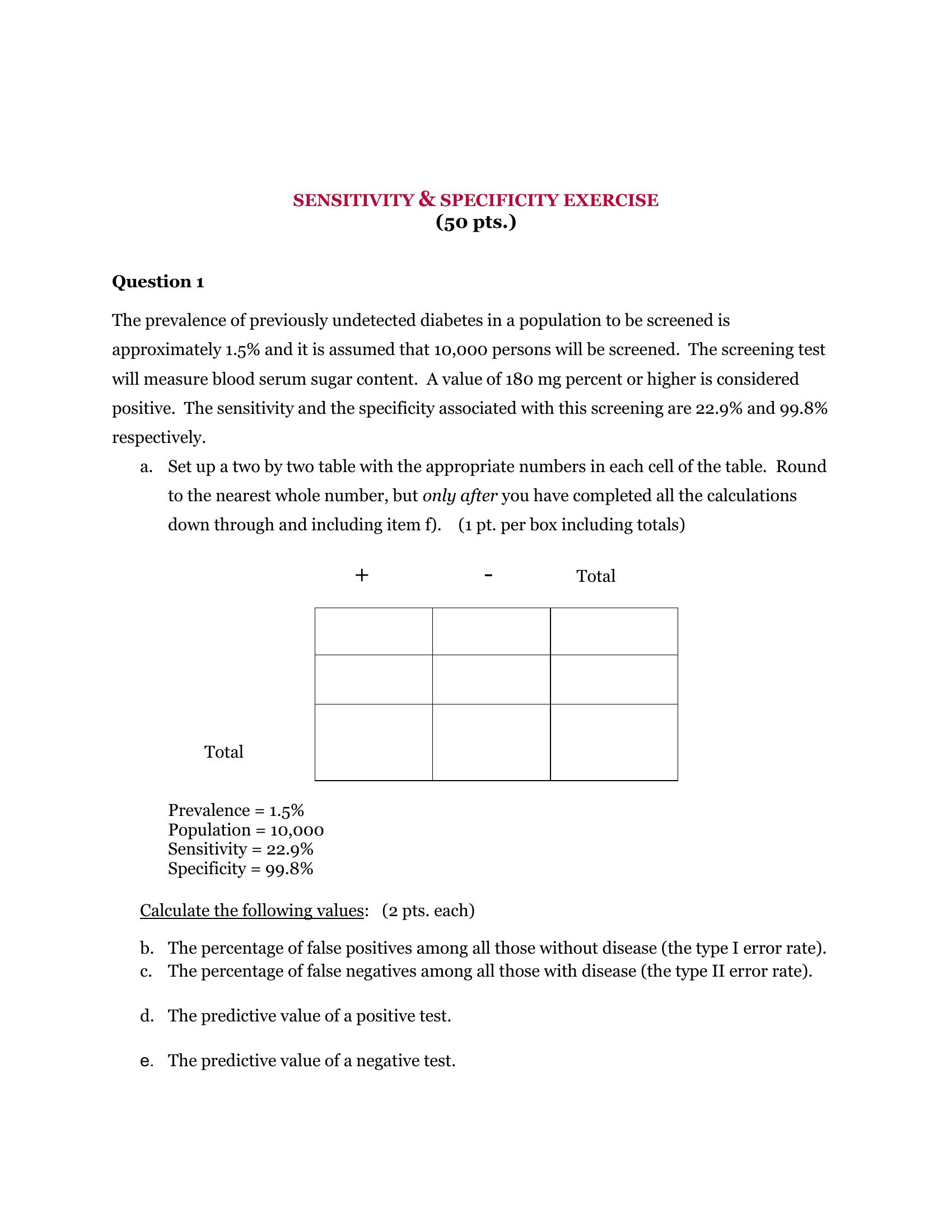 SENSITIVITY & SPECIFICITY EXERCISE (50 pts.) Question 1 The ...