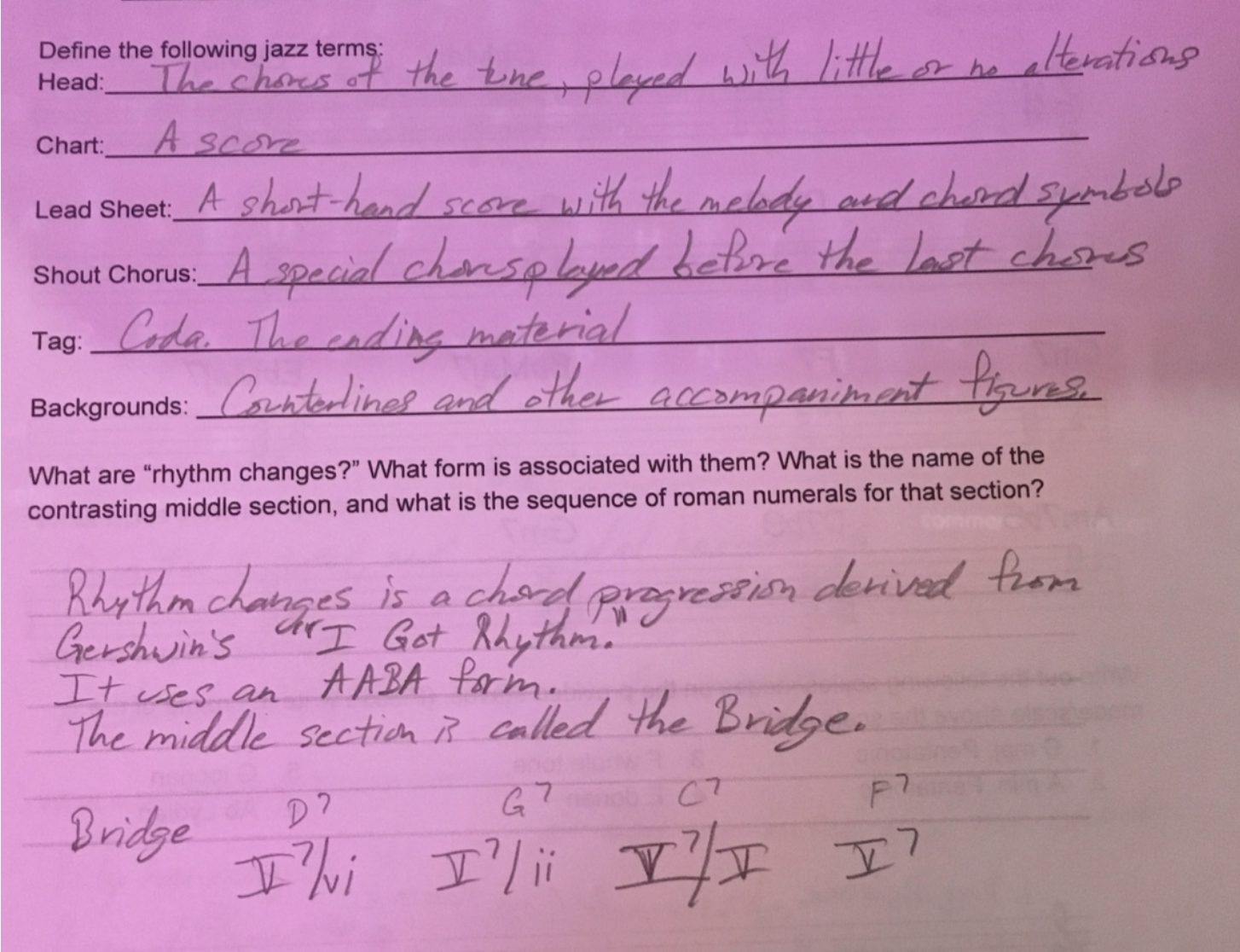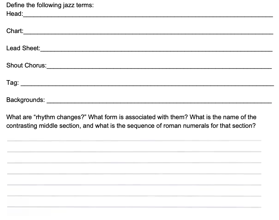 Define the following jazz terms: Head: Chart: Lead Sheet: Shout...