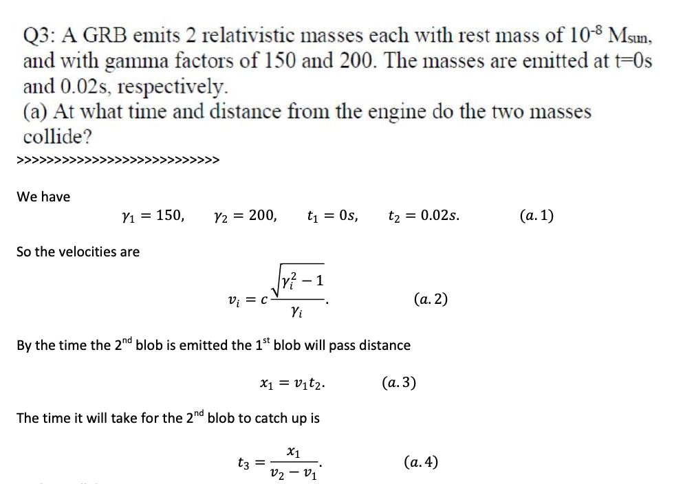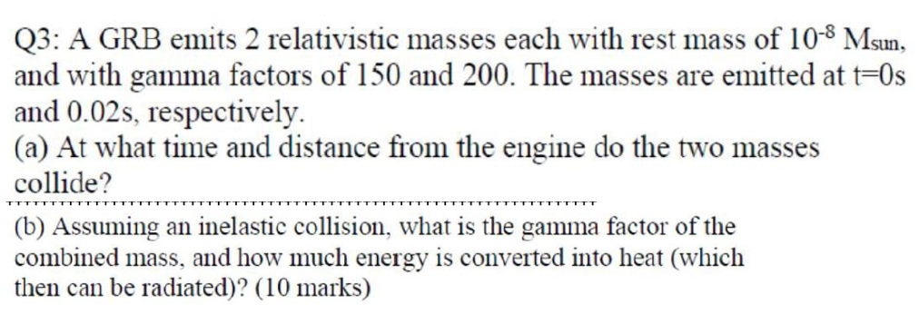 Q3: A GRB emits 2 relativistic masses each with rest mass of 10-8 M...