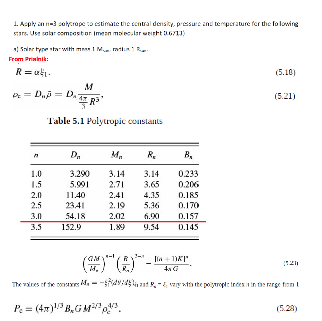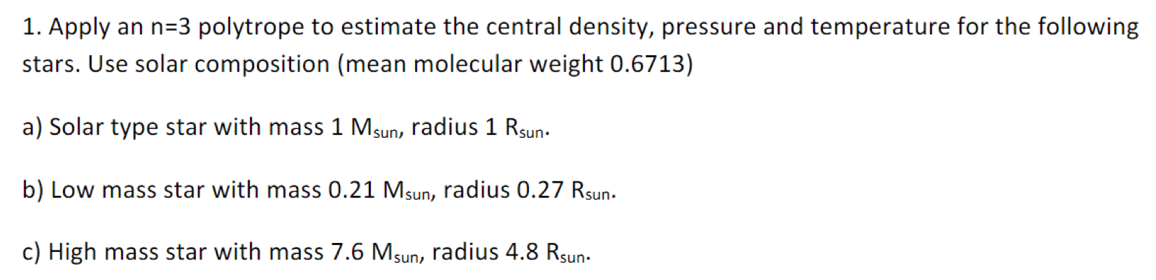 1. Apply an n=3 polytrope to estimate the central density, pressure...