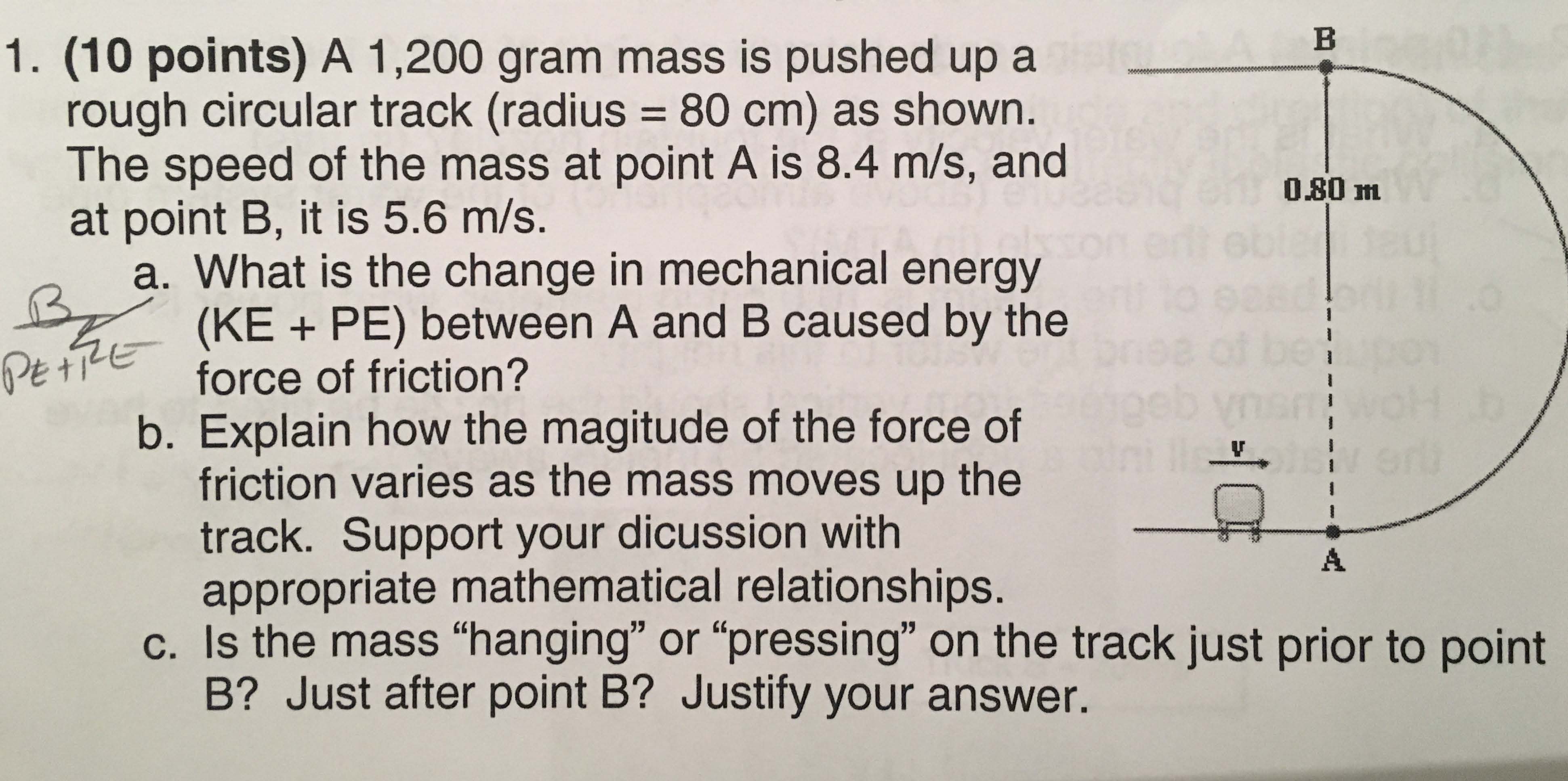 1. (10 points) A 1,200 gram mass is pushed up a B on rough circu...