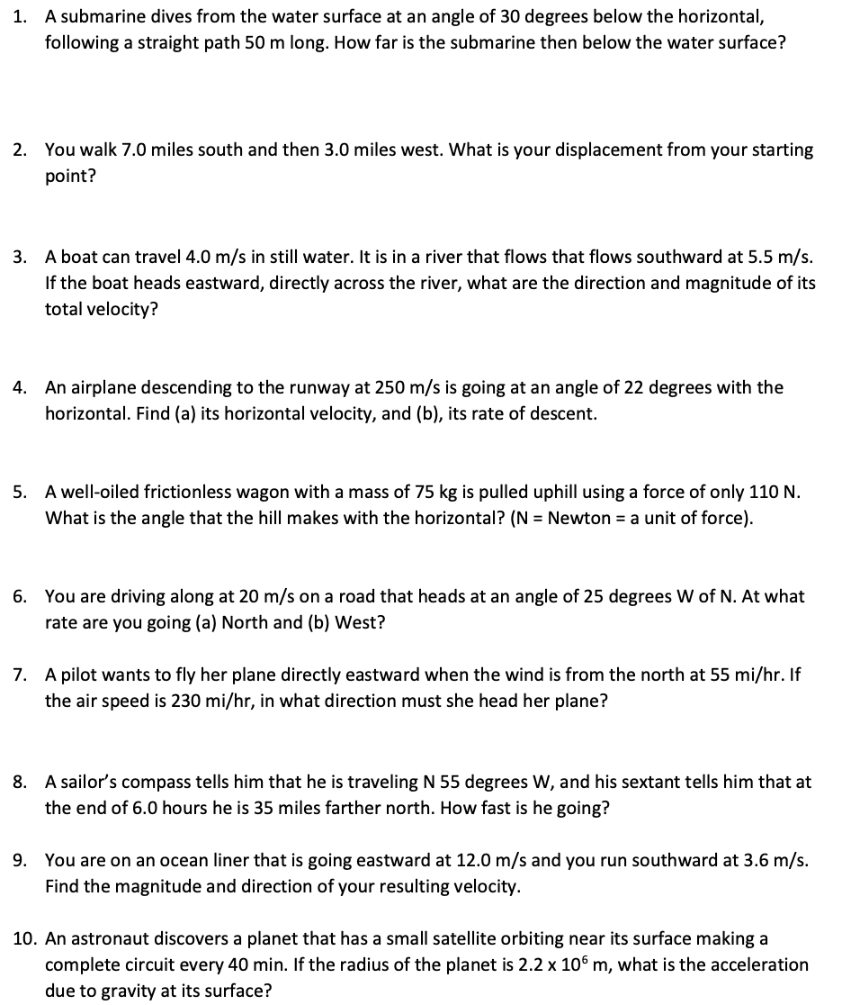 1. A submarine dives from the water surface at an angle of 30 degre...