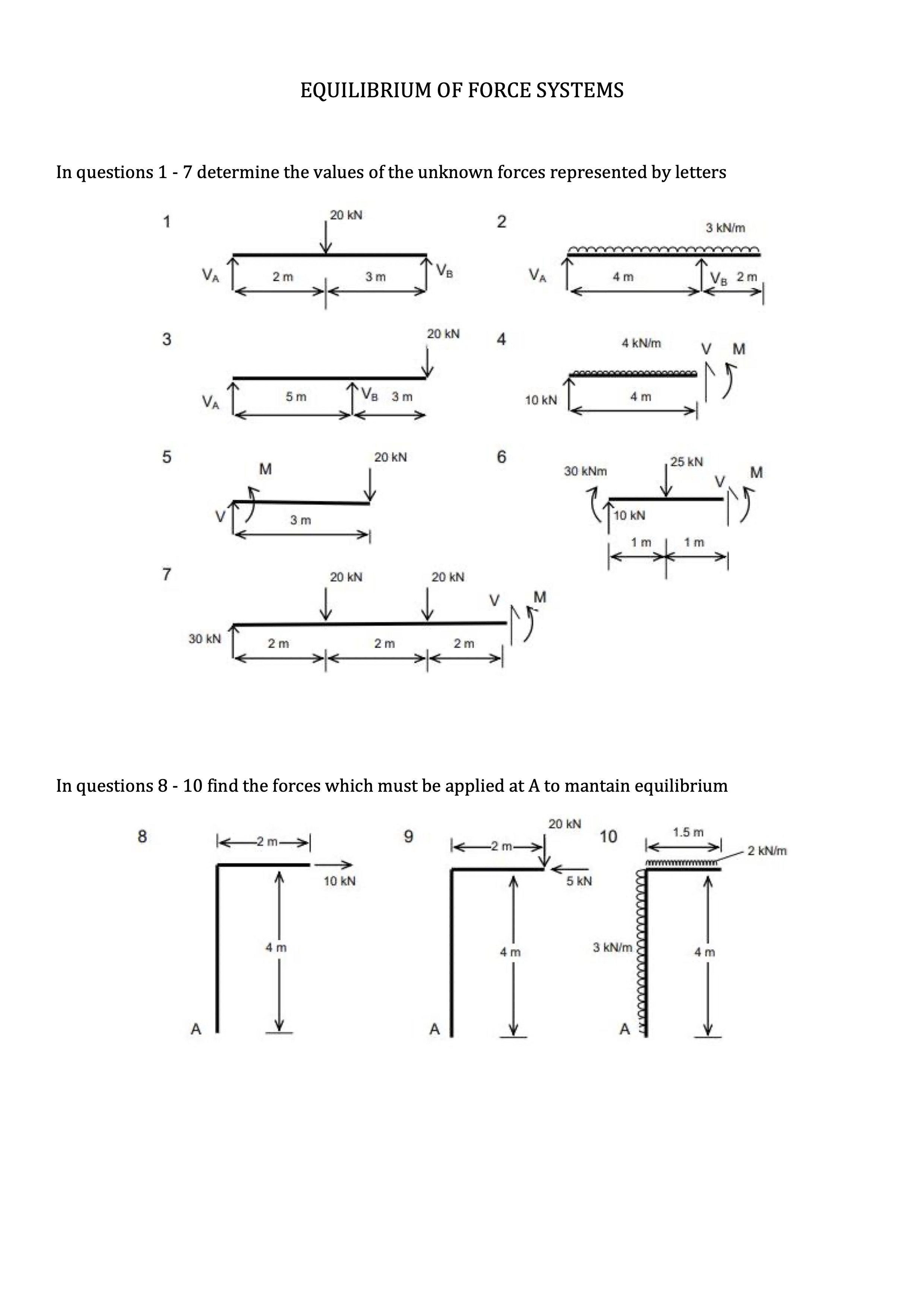 EQUILIBRIUM OF FORCE SYSTEMS In questions 1 7 determine the values...