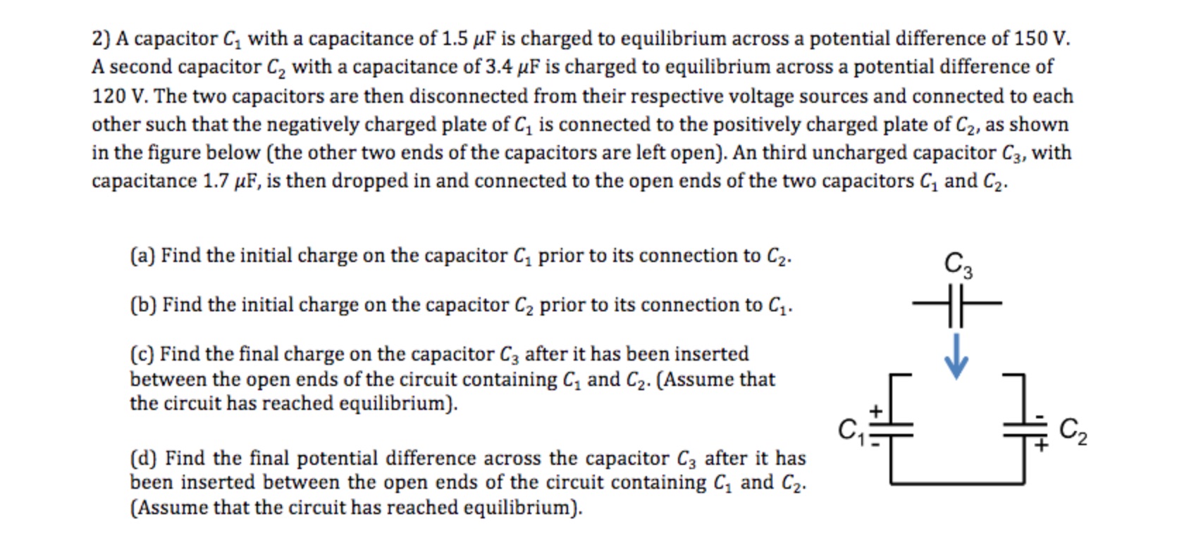 2) A capacitor C1 with a capacitance of 1.5 uF is charged to equili...