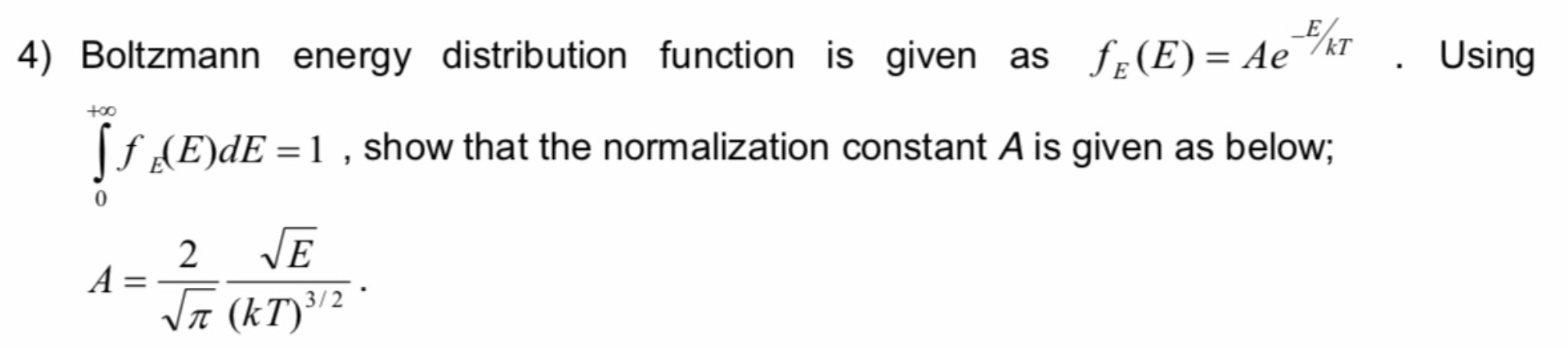 4) Boltzmann energy distribution function is given as fg(E)=Ae /r...