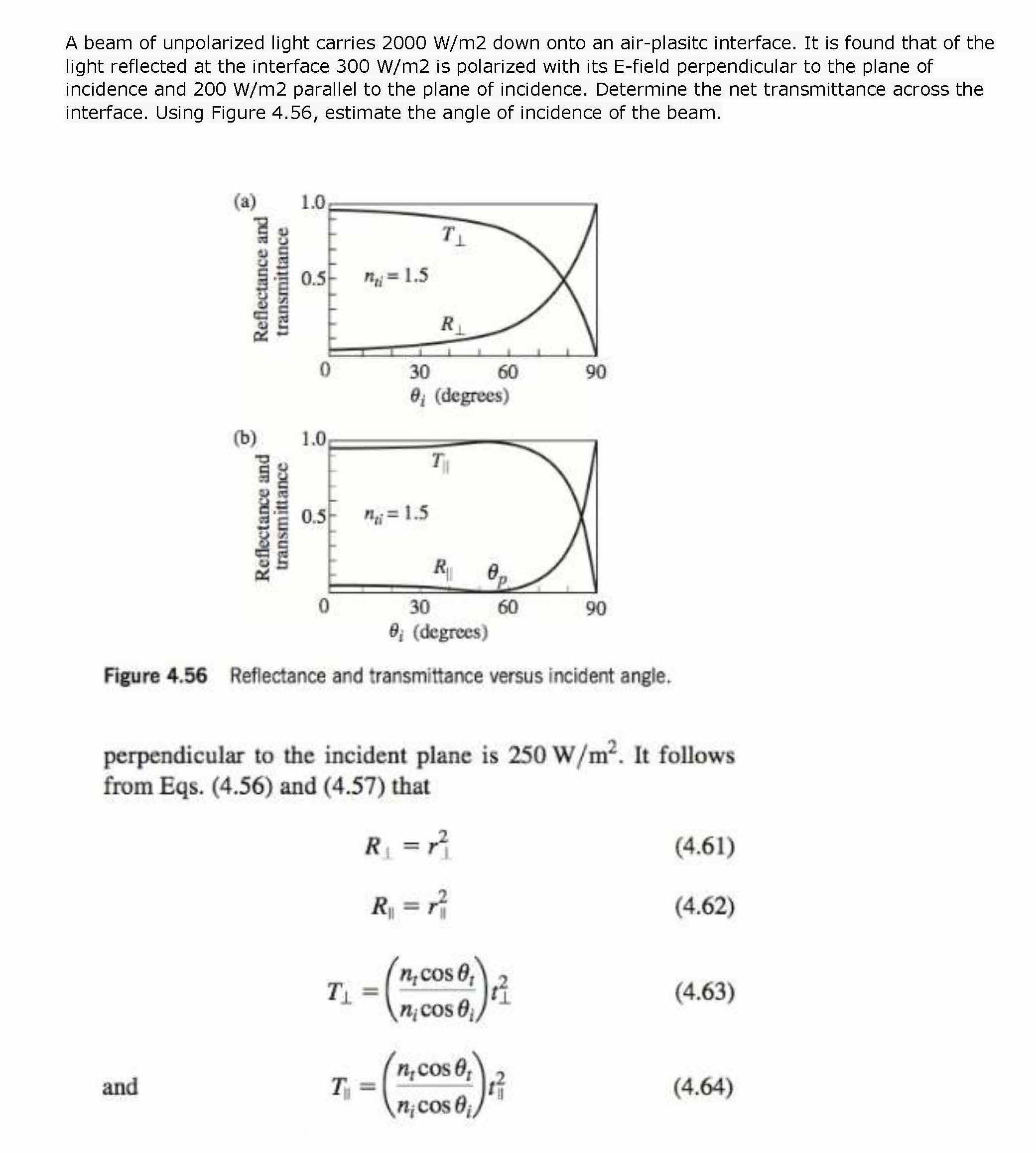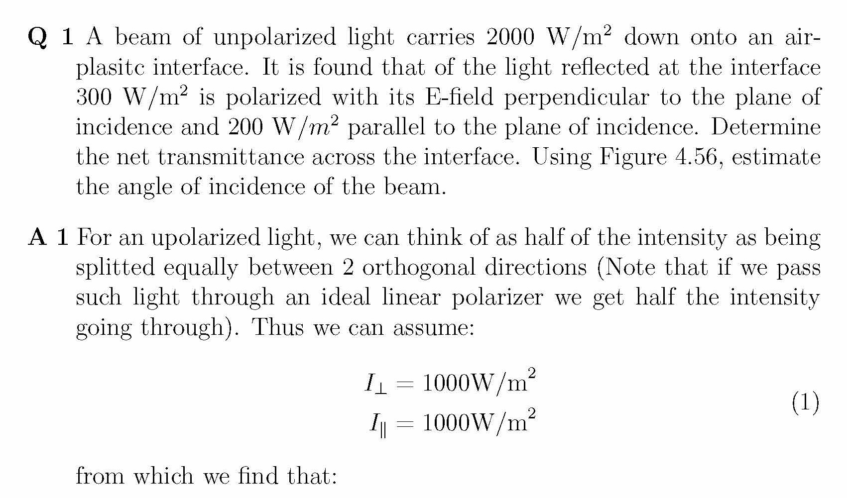 A beam of unpolarized light carries 2000 W/m2 down onto an air-plas...