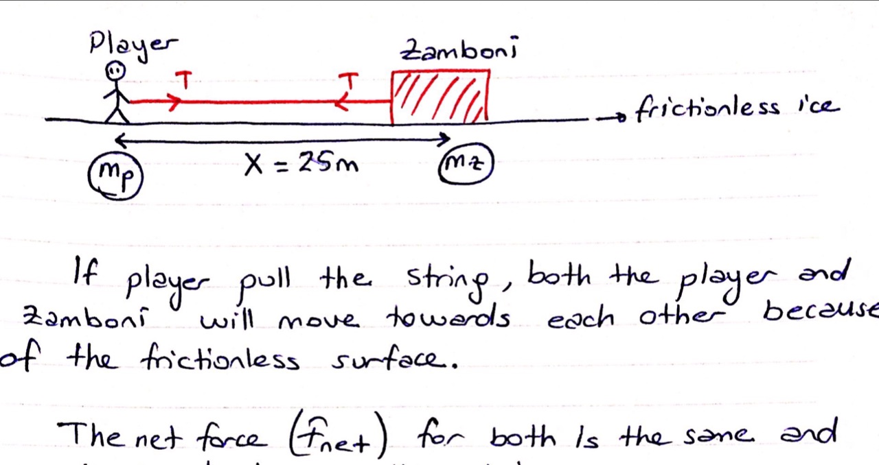 A hockey player weighing 650 N has a rope around a broken Zamboni m...