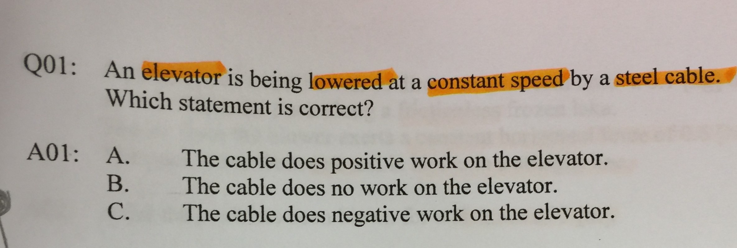 Q01: An elevator is being lowered at a constant speed by a steel ca...