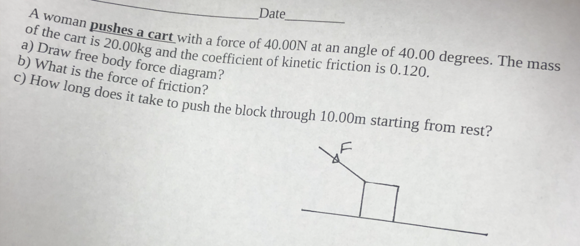 Date A woman pushes a cart with a force of 40.00N at an angle of 4...
