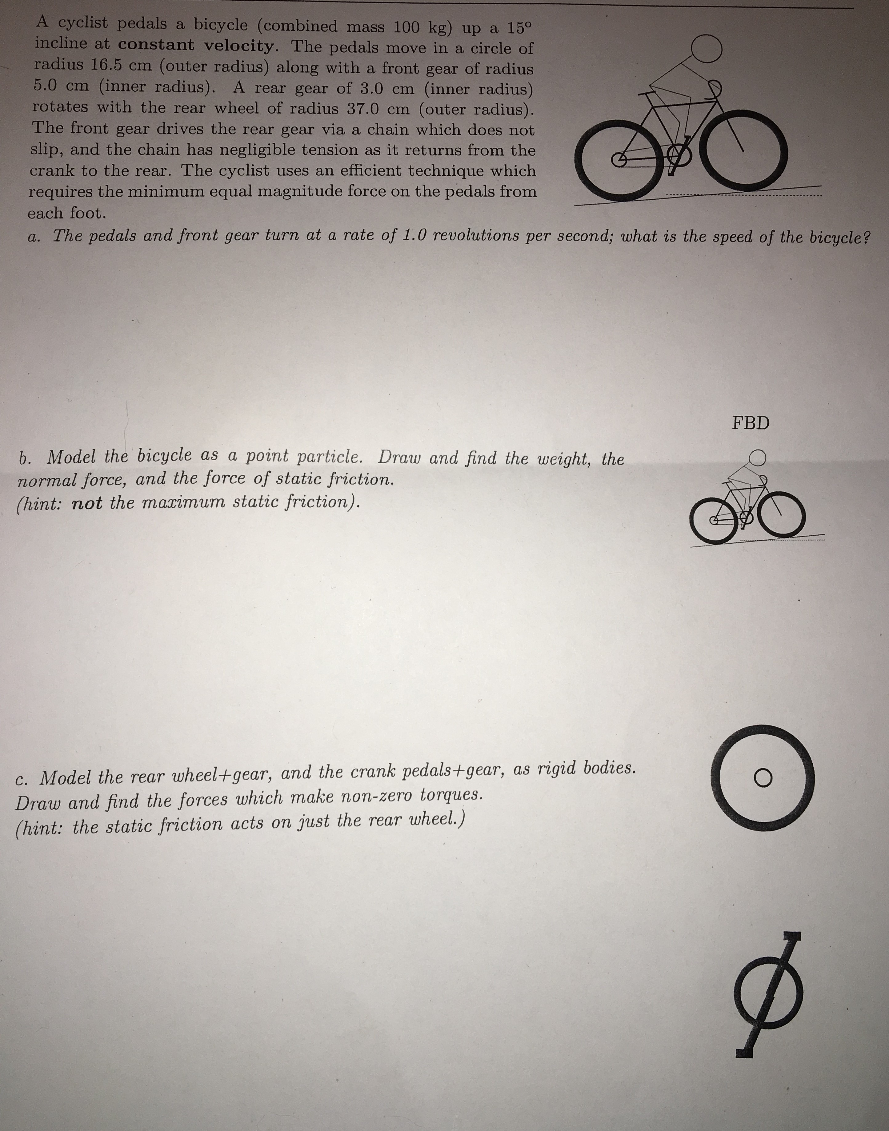 A cyclist pedals a bicycle (combined mass 100 kg) up a 15° incl...