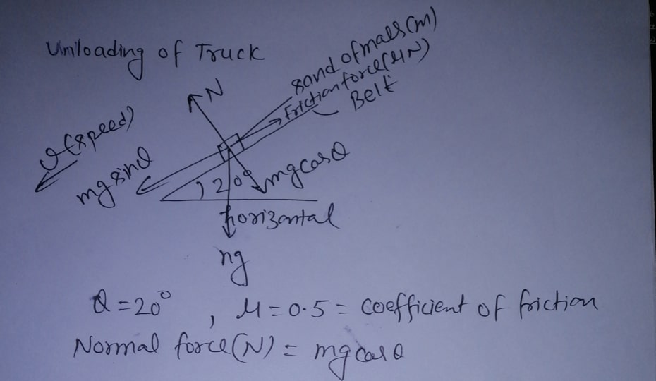 A conveyor belt is used to unload sand in a truck. The conveyor bel...