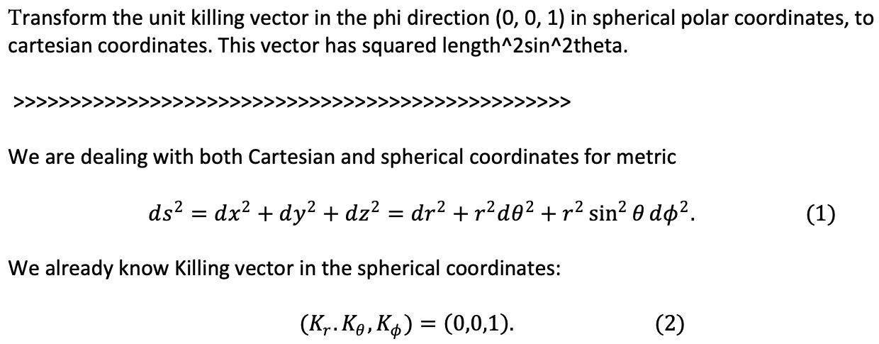 Transform the unit killing vector in the phi direction (0, 0, 1) in...