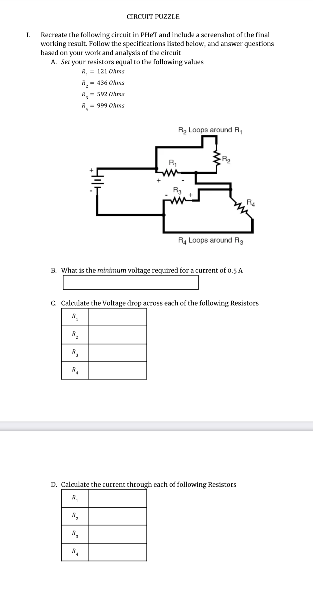 CIRCUIT PUZZLE I. Recreate the following circuit in PHeT and incl...
