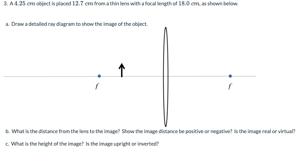 3. A 4.25 cm object is placed 12.7 cm from a thin lens with a focal...
