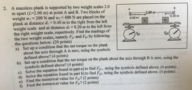 2. A massless plank is supported by two weight scales 2.0 A B m ...