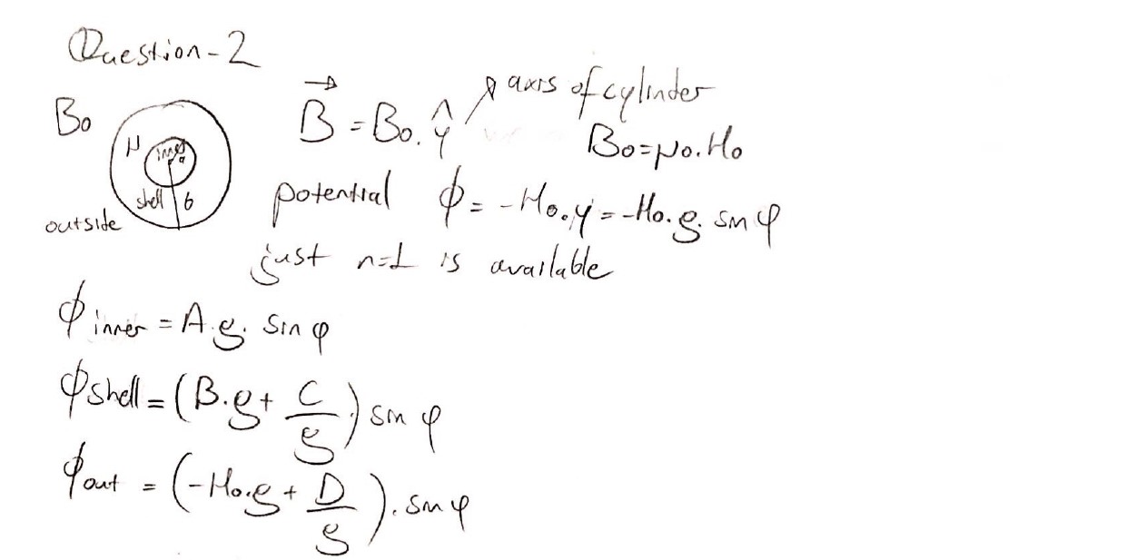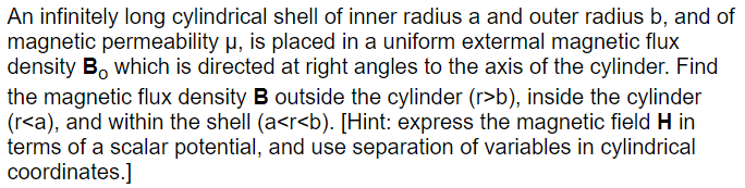 An infinitely long cylindrical shell of inner radius a and outer ra...