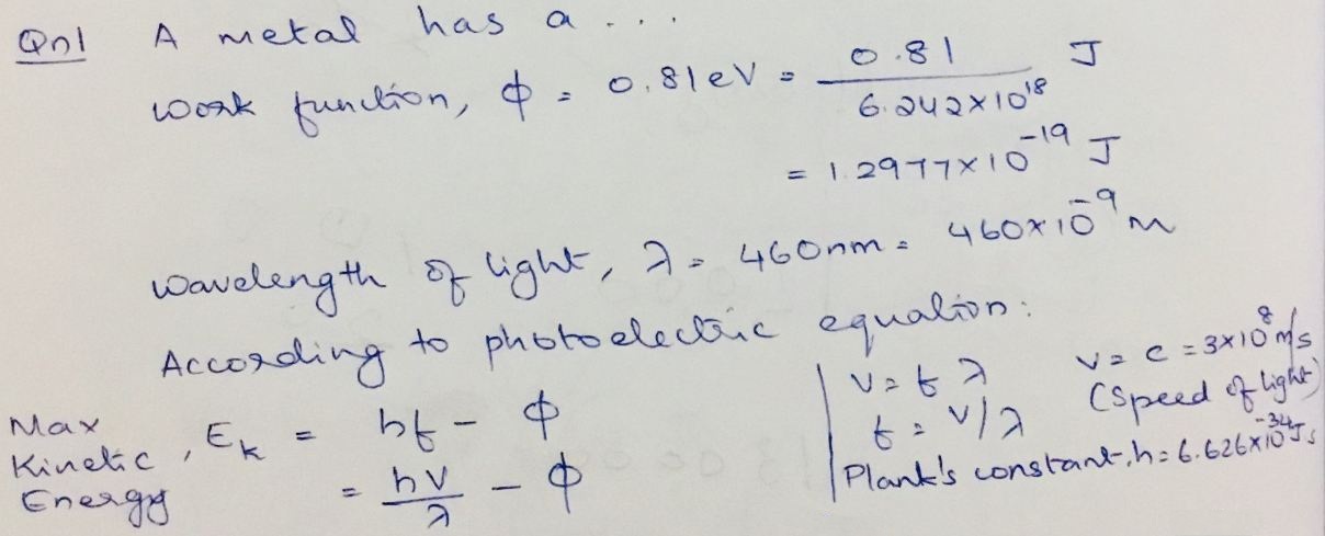 Q1) A metal has a work function of 0.81eV. What is the maximum kine...