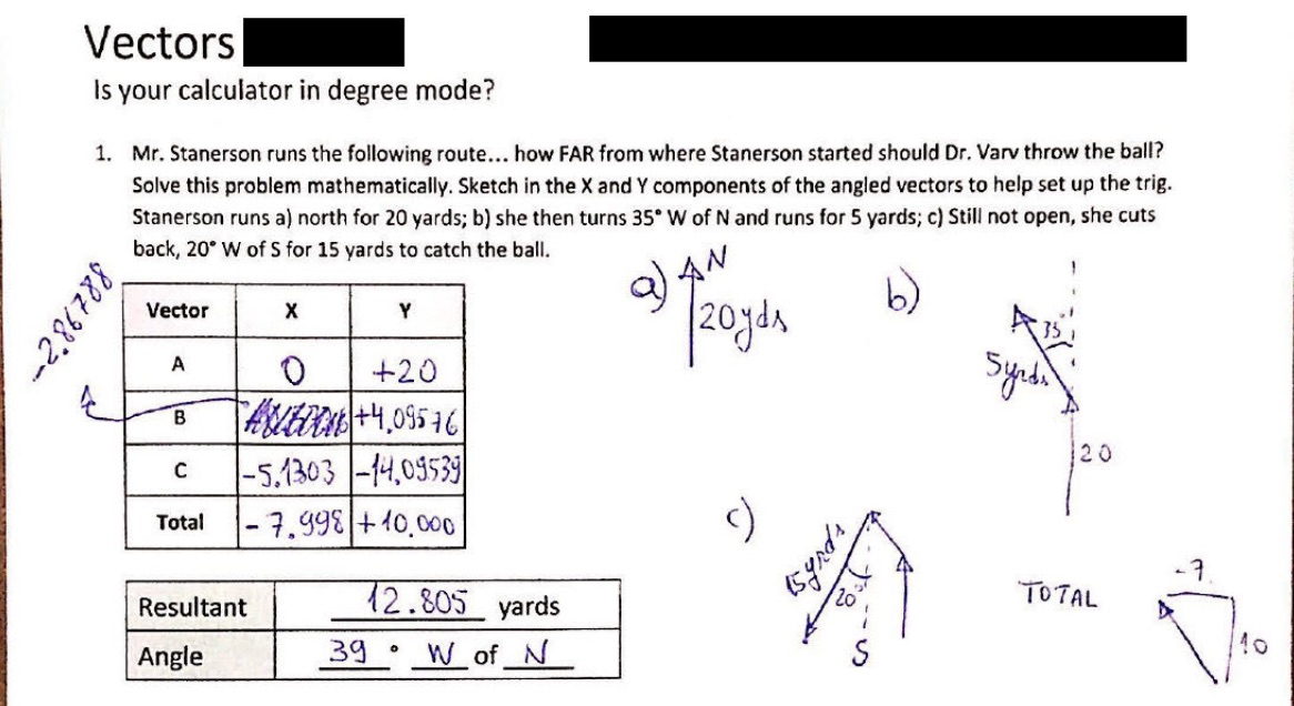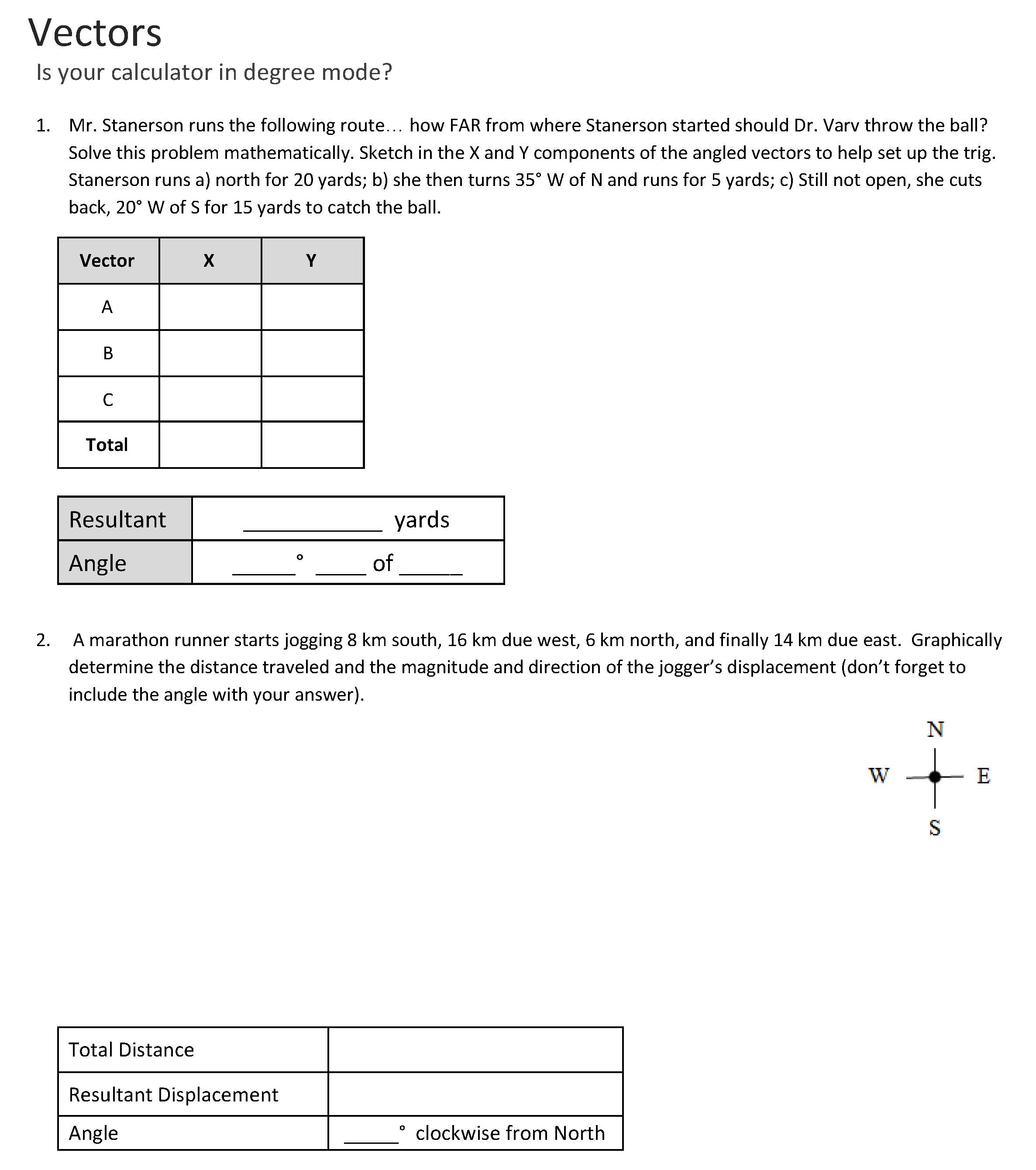Vectors Is your calculator in degree mode? 1. Mr. Stanerson runs ...