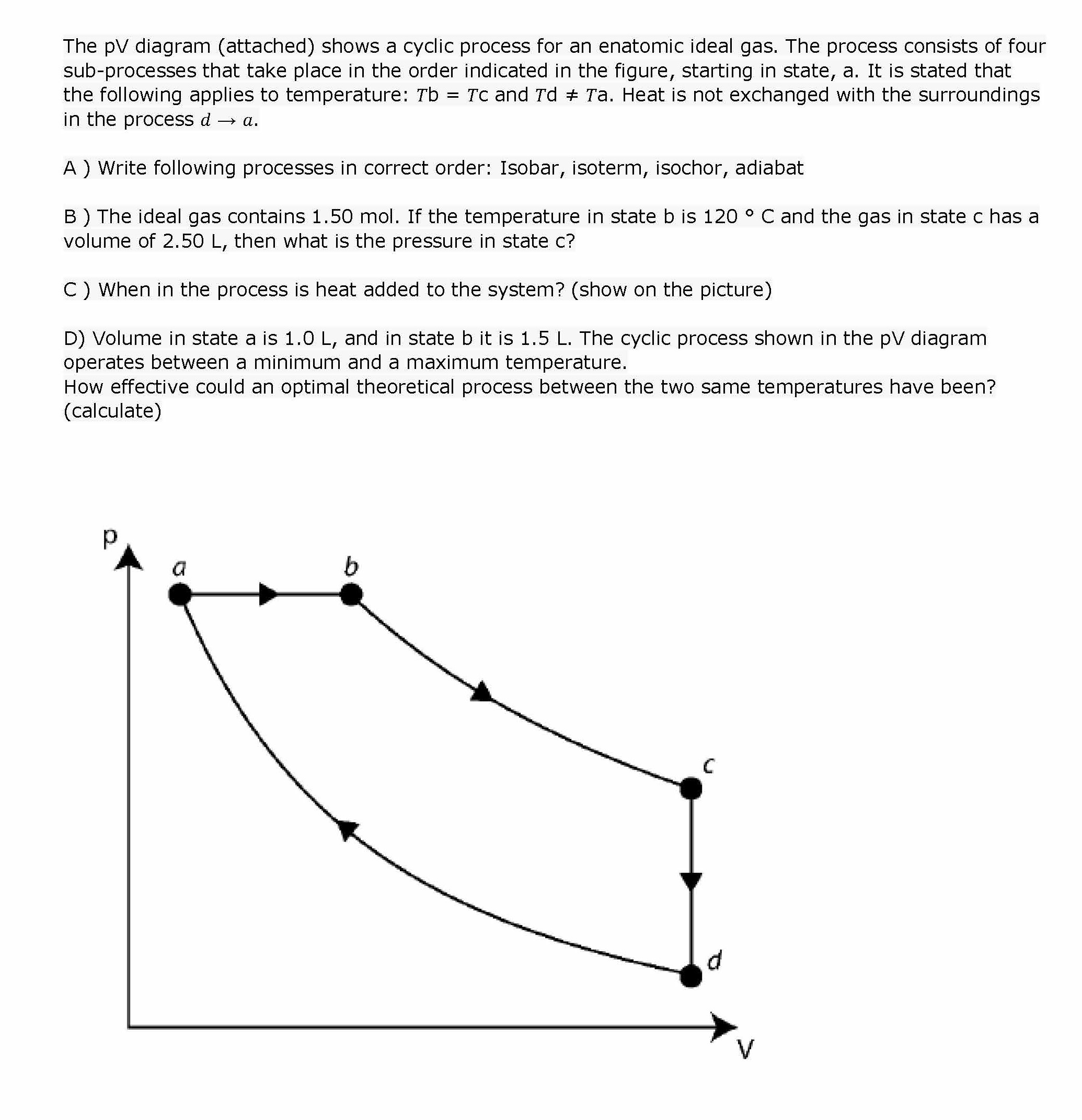 The pV diagram (attached) shows a cyclio process for an enatomic id...