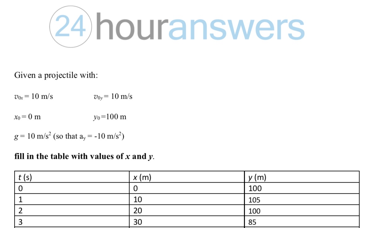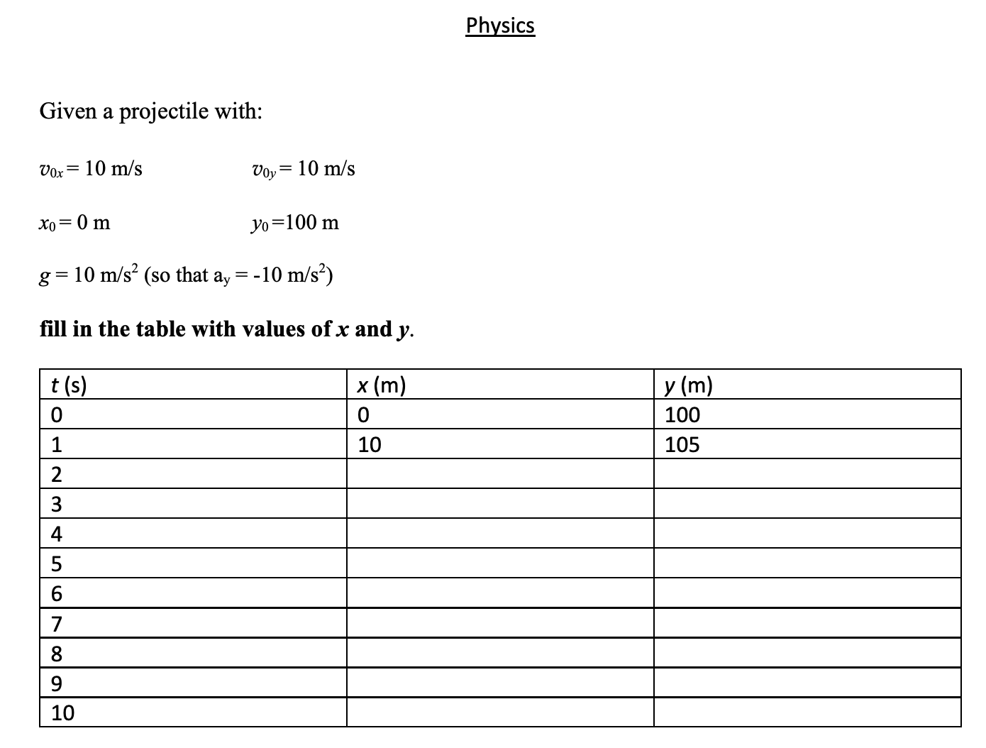 Physics Given a projectile with: v0x = 10 m/s v0y = 10 m/s x0 = ...