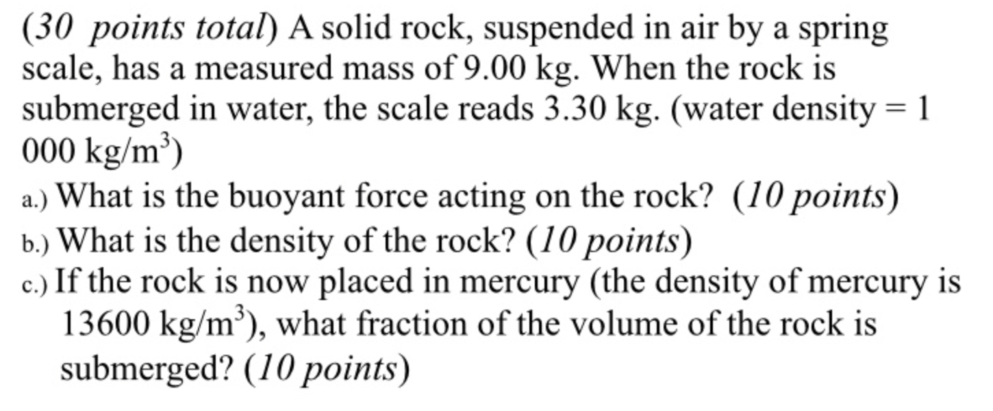 (30 points total) A solid rock, suspended in air by a spring scale...