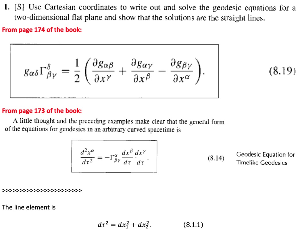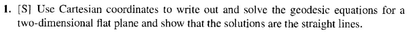1. [S] Use Cartesian coordinates to write out and solve the geodesi...