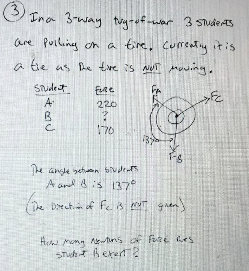 3 Ina 3-way tug-of-war 3 students are Pulling on a tire. currentl...