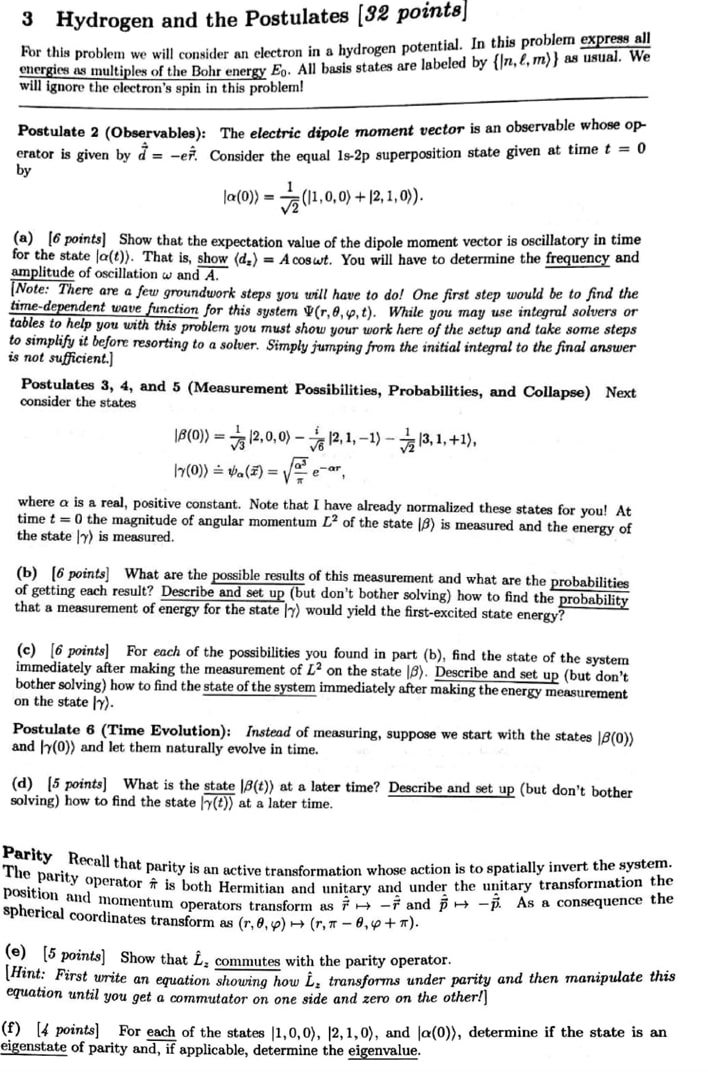 3 Hydrogen and the Postulates [32 points] an electron in a hydrog...