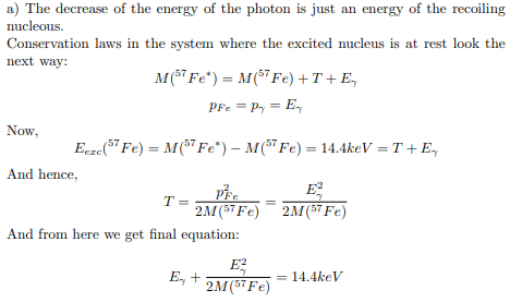 An excited iron (Fe) nucleus (mass 57 u) decays to it's ground stat...