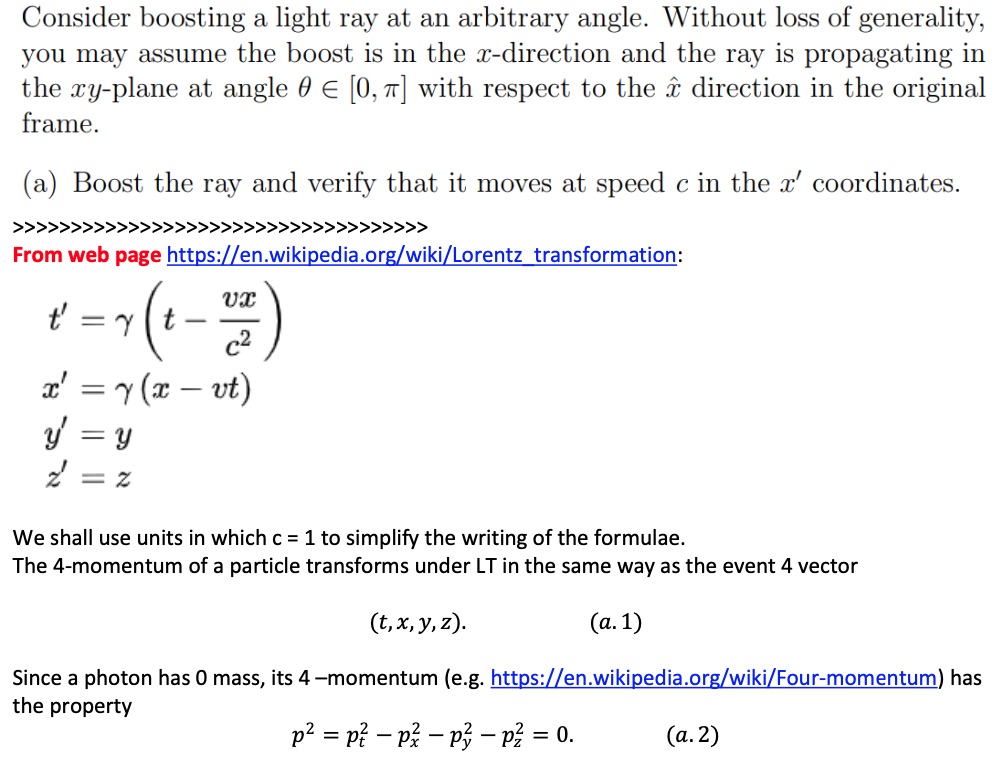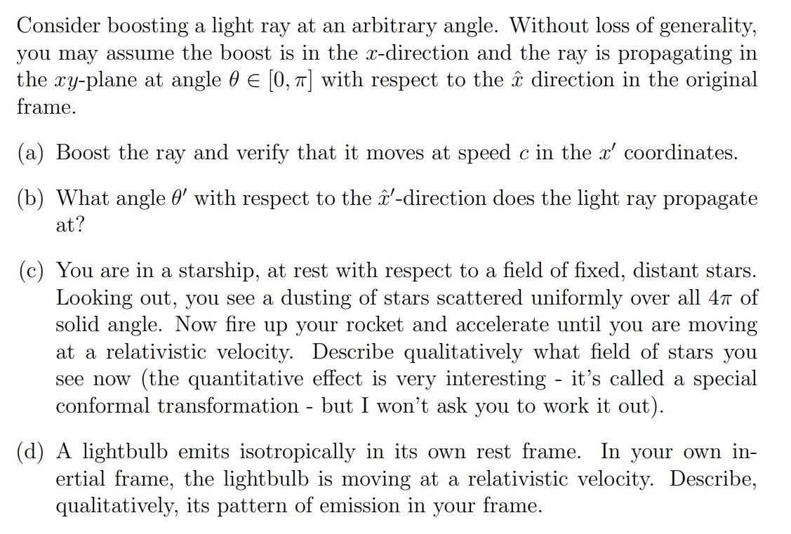Consider boosting a light ray at an arbitrary angle. Without loss o...