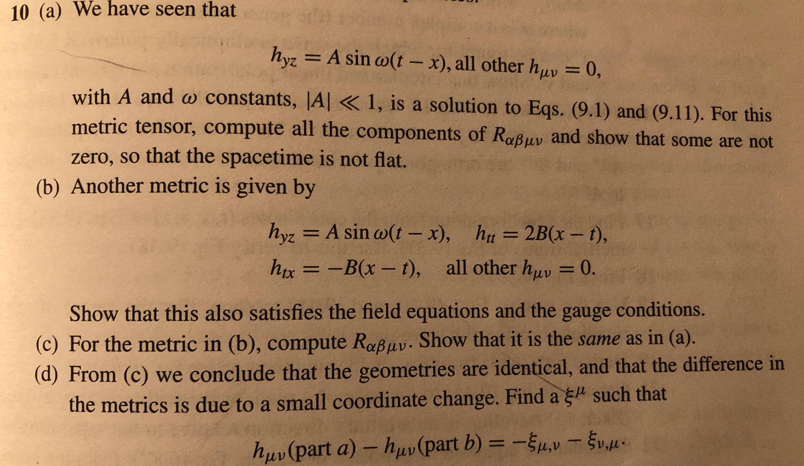 10 (a) We have seen that hyz = A sinw(t - x), all other huv =0, w...