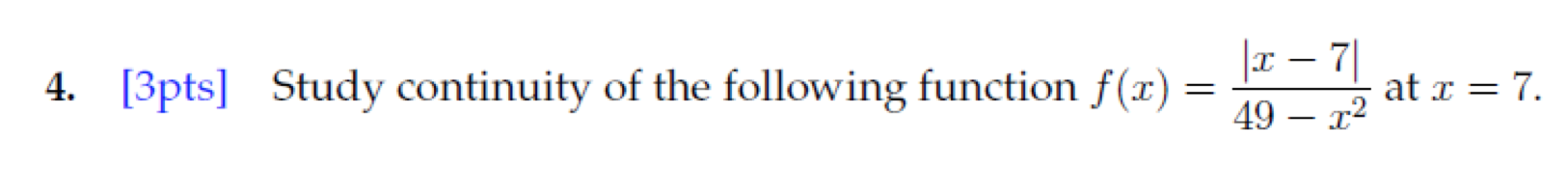 4. [3pts] Study continuity of the following function f(x) = - at x...